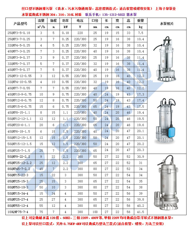 QWP型自带浮球式不锈钢污水泵整泵不锈钢精密铸造,从最小的0.18KW-1.5KW范围内单相220V定制成自带浮球式,如果三相380V也想要有液位功能那么就配套控制柜实现外置浮球自动控制功能。